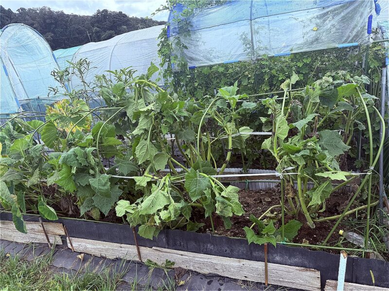 ヤーコンは強い日差しを嫌うので日よけネットは必要だがそろそろ太陽に当てて葉の生育を促す。