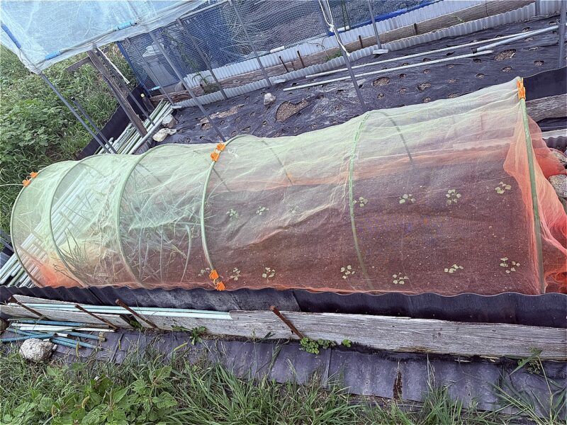 ◆ミニ大根が大きくなって来たので不織布は取り、代わりにトンネル支柱を刺して防虫ネットを掛けておく。