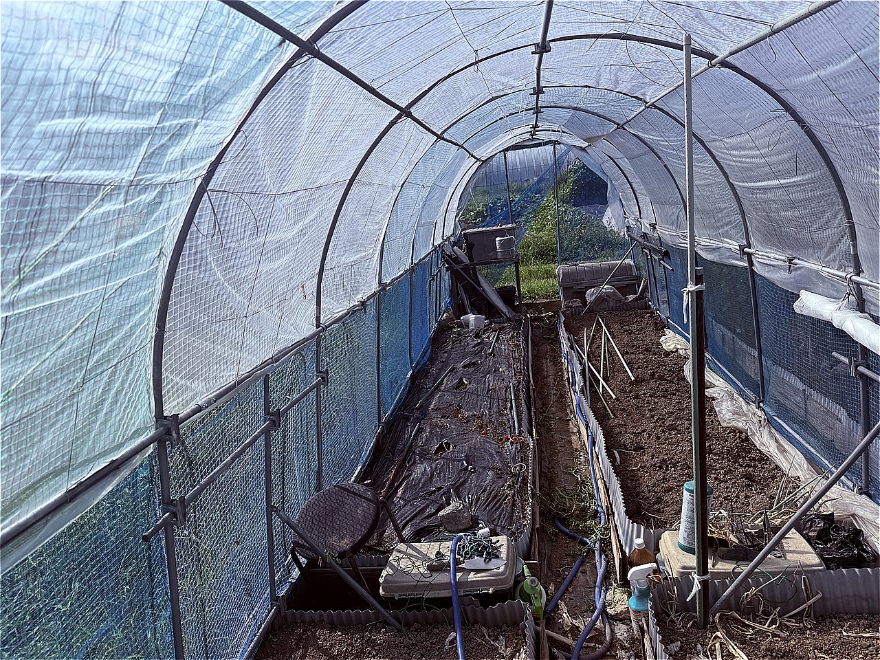 雨除けトンネルの外に苗を引っ張り出して残りの支柱も撤去して次の野菜の準備を進める。