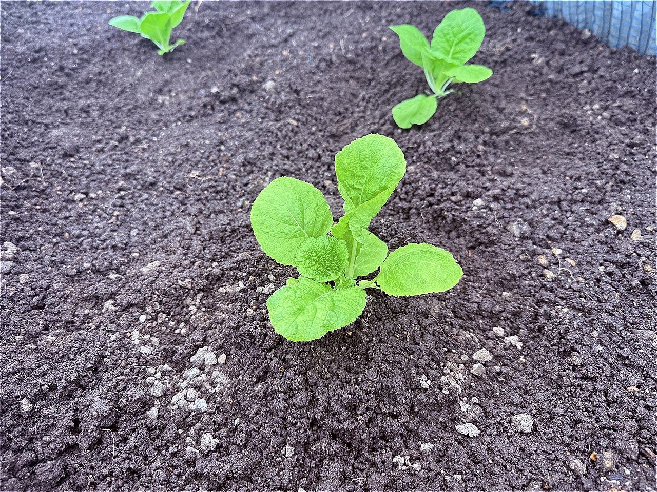小さなカタツムリを1匹とダイコンハルサムシを5~6匹見つけて潰した。