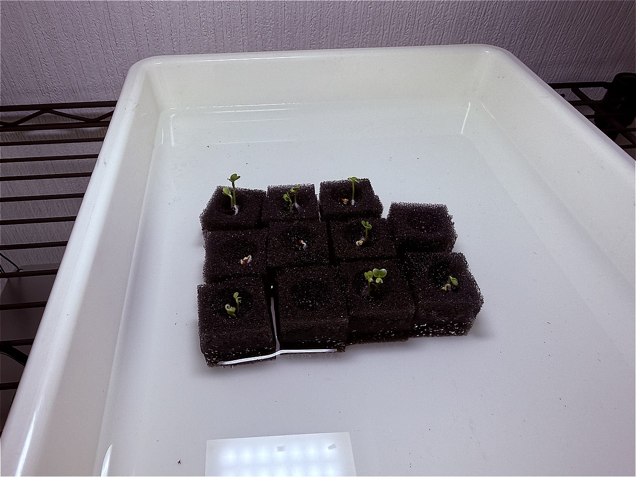 スポンジの下から根っこが伸びて来る頃に水耕栽培の容器に移して本格的な栽培が始まって行く。