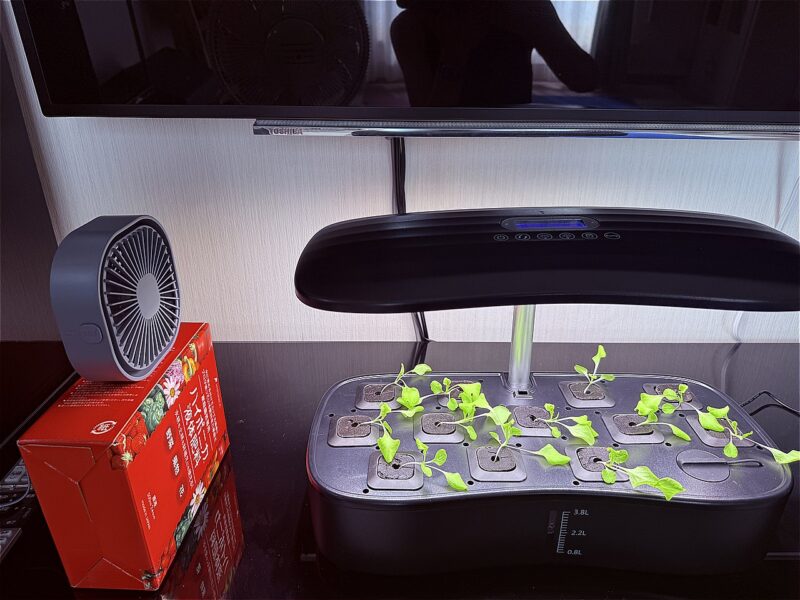 栽培セットのレタスはまだ本葉が出始めた程度ですが、光も弱く全体に弱弱しく感じるので卓上ファンを買って風を送る様にした。