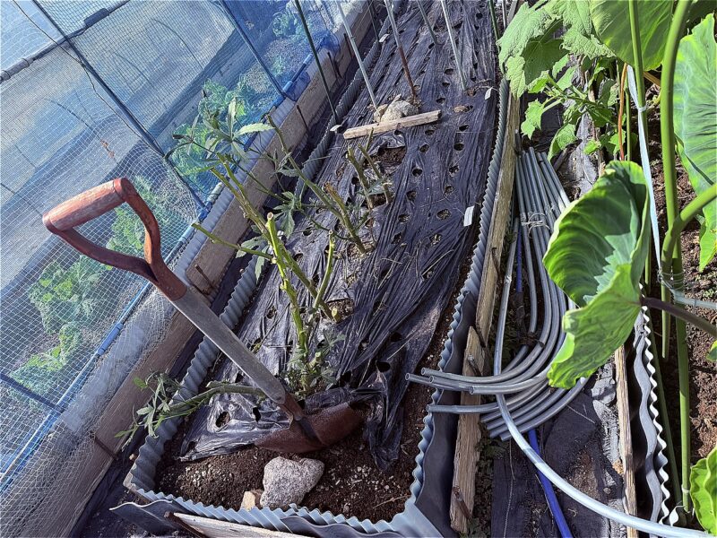この畝の半分で育てたゴーヤ苗は撤収したがトンネル支柱は残っていたのでオクラ苗の撤収序に畝全体を綺麗に片付ける事にしました。