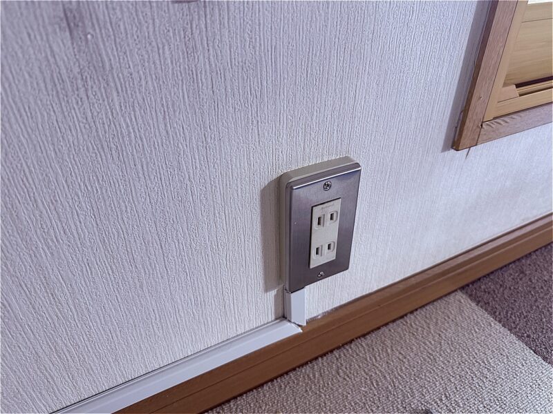厚みのある継ぎ枠を使ってコンセントからVVFケーブルを引き出してモールで壁下を這わせて行く。