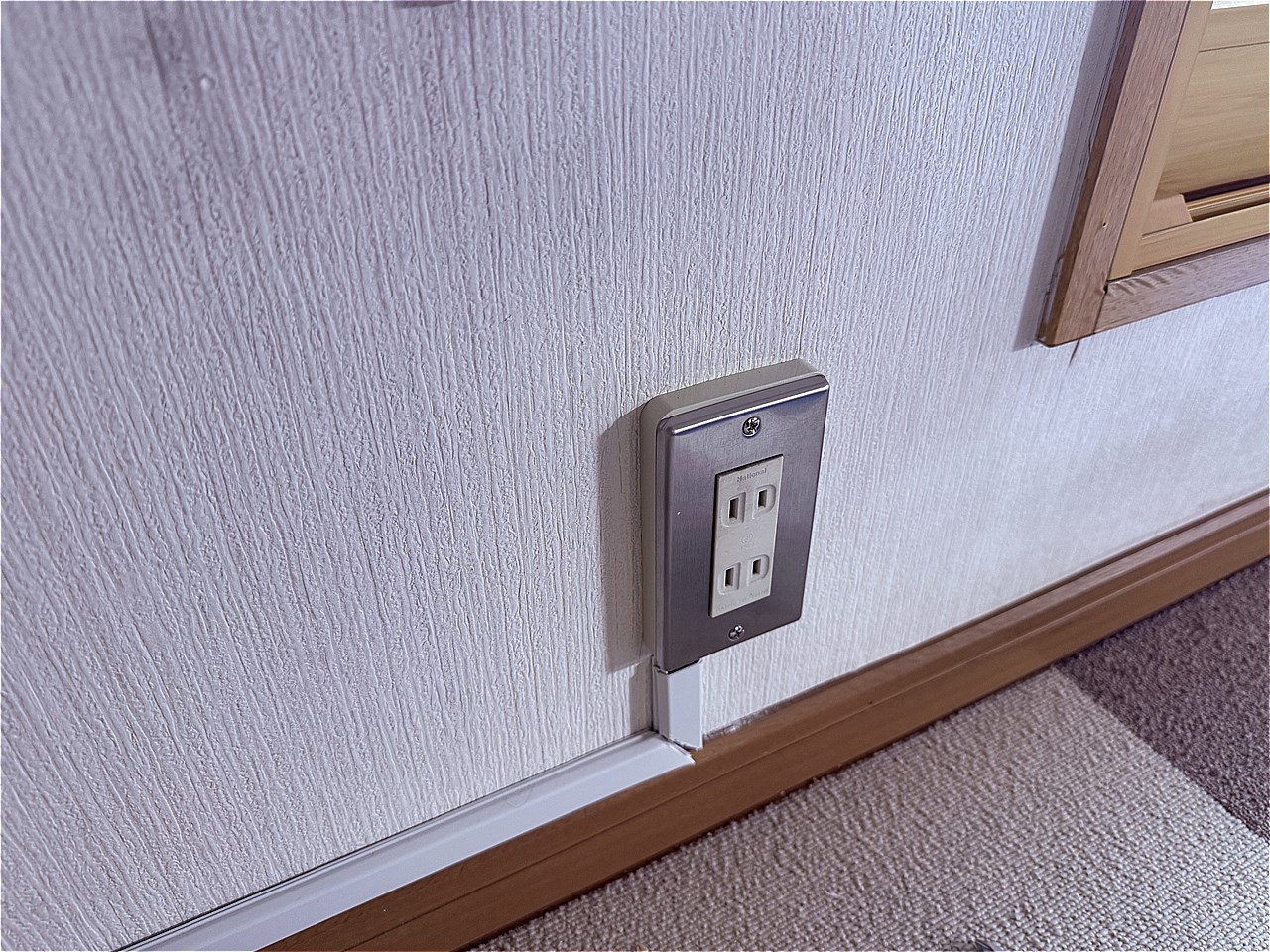 厚みのある継ぎ枠を使ってコンセントからVVFケーブルを引き出してモールで壁下を這わせて行く。