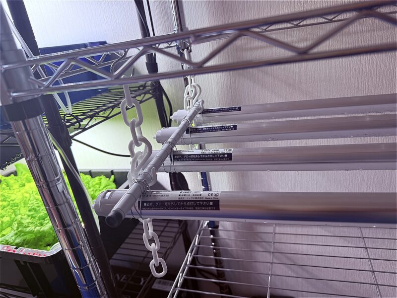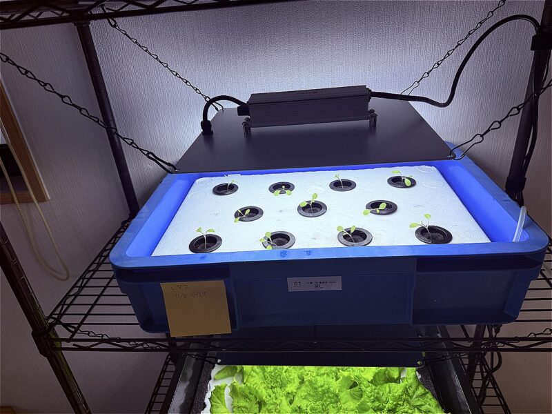 このレタスの上の段でも新たにレタスの苗を定植して栽培を始めましたが、苗が少し徒長気味かな。