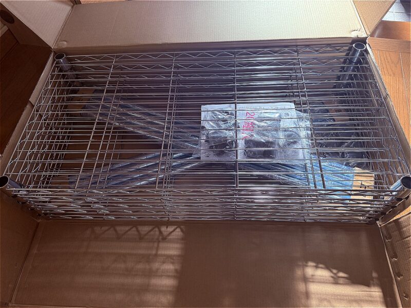 ネットで頼んだスチール棚(幅が90cm、奥行き45cm 高さが190cmくらい有る)が今日届いた。