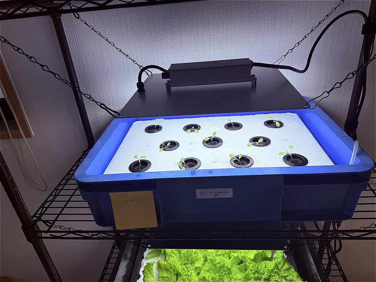 このレタスの上の段でも新たにレタスの苗を定植して栽培を始めましたが、苗が少し徒長気味かな。