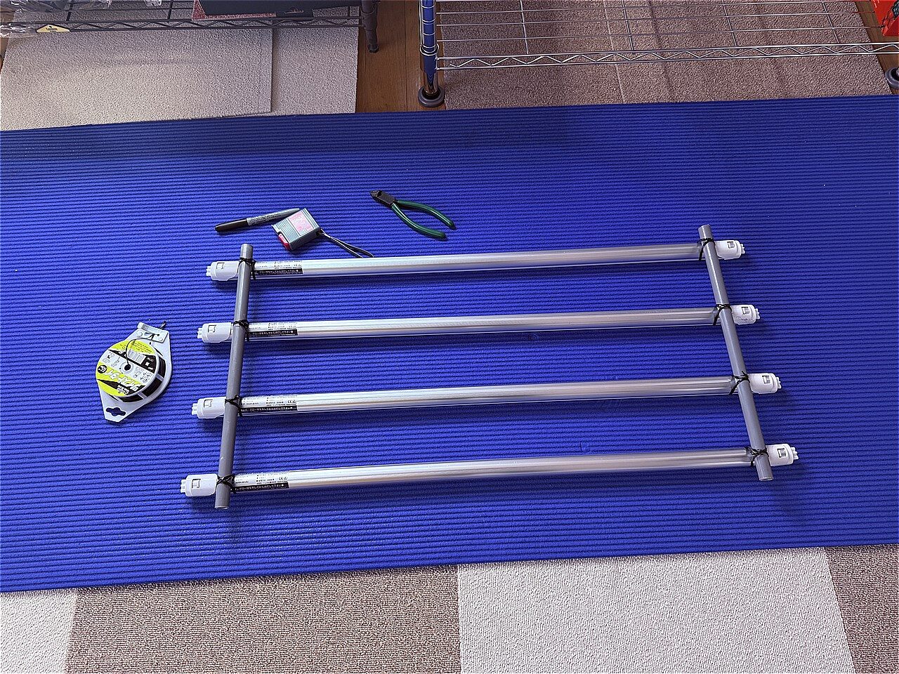 このコンテナに対して4個のLED照明直管を使って照明装置を組み立てていく。