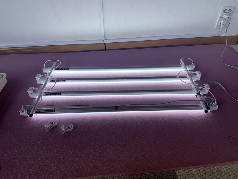 ラック(棚)も追加して1組分を先にLED照明とぶくぶく(エアーポンプ)を設置して栽培を始めているが、今日は新たにLED照明を組み立ててみる。