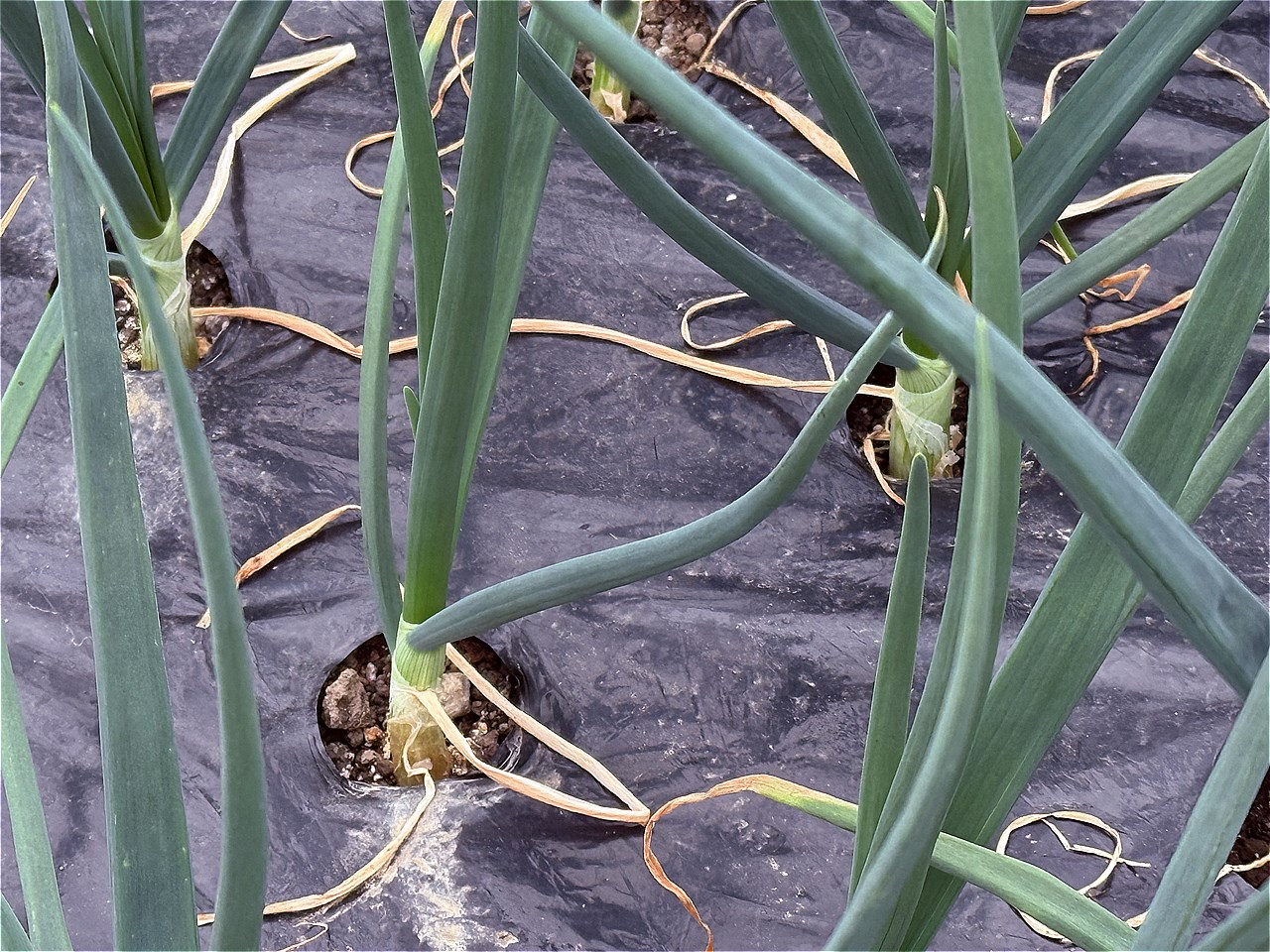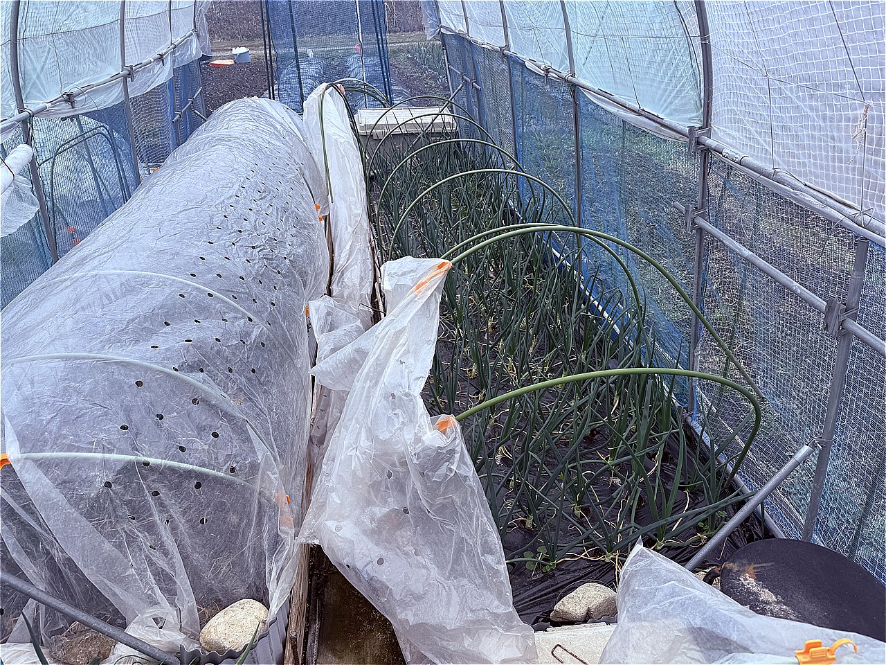 ビニールと一部の支柱は横に飛んでいましたがタマネギは順調に育っているようです。